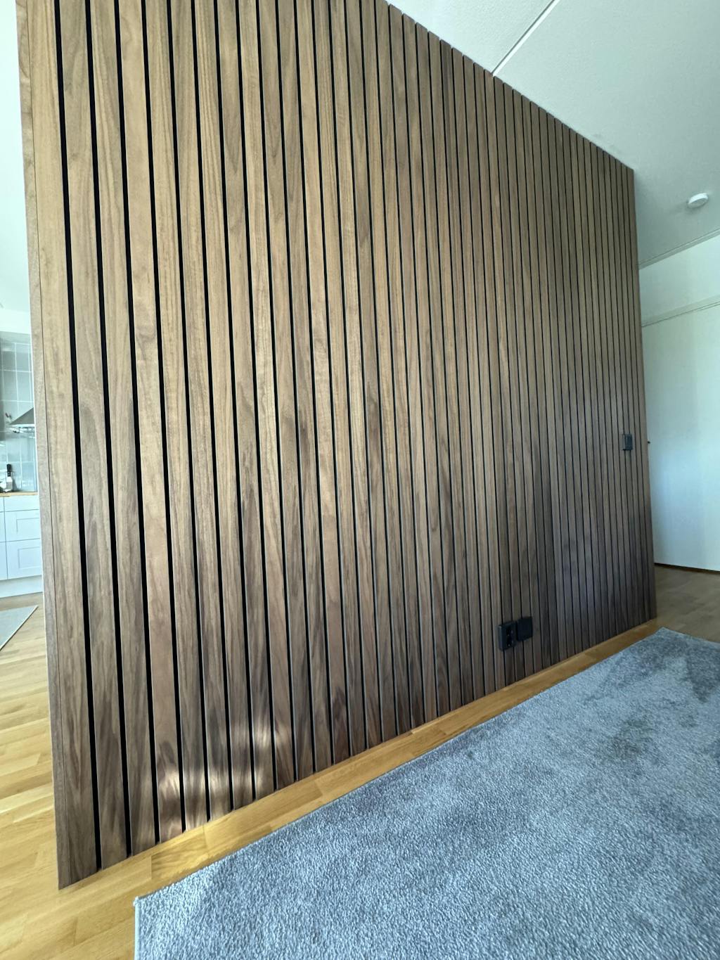 Denna variant har 50 mm breda ribbor med endast 10 mm mellanrum, i jämförelse med 27 mm breda ribbor och 13 mm mellanrum som resten av vårt sortiment. Vi började med att erbjuda denna i valnöt, då det är vårt bäst säljande träslag (nu finns denna variant även i oljad ek). Valnöt är känt för sin naturliga skönhet och rika färgtoner, det är ett exklusivt träslag.